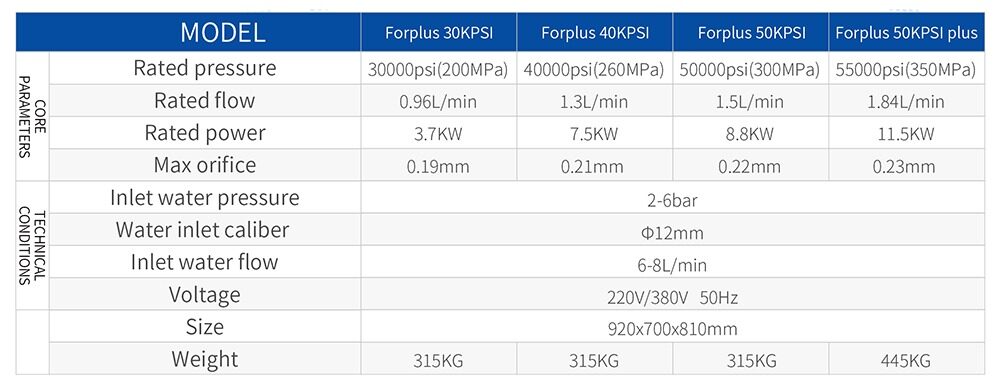 ForPlus D50KPlus can support 0.23mm orifice at 55,000 psi(350Mpa) with rated flow of 1.84L, but only need 11.5kw power, while a traditional intensifier pump needs 37.3kw to deliver similar performance. Up to 70% energy saving!